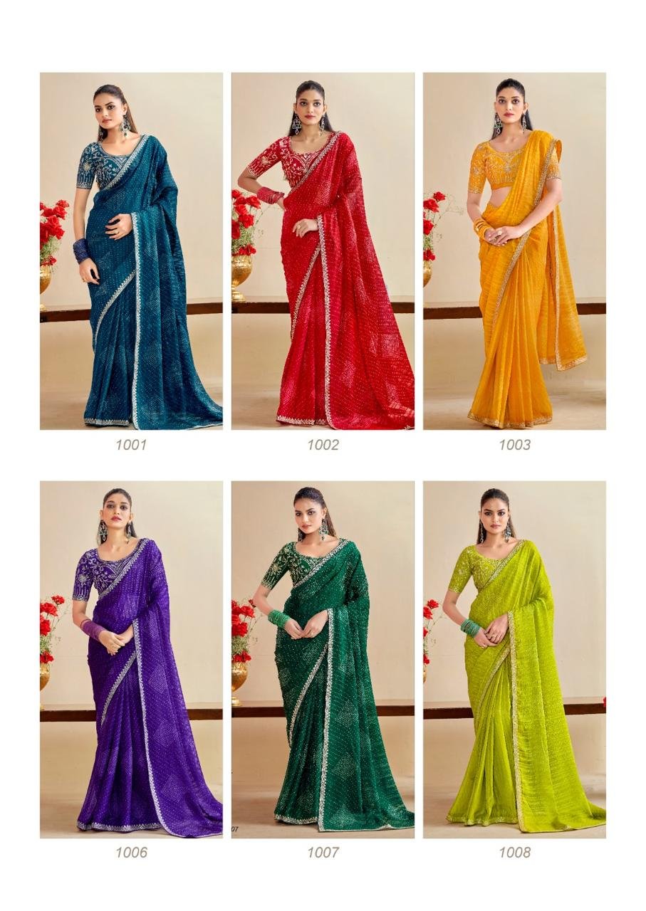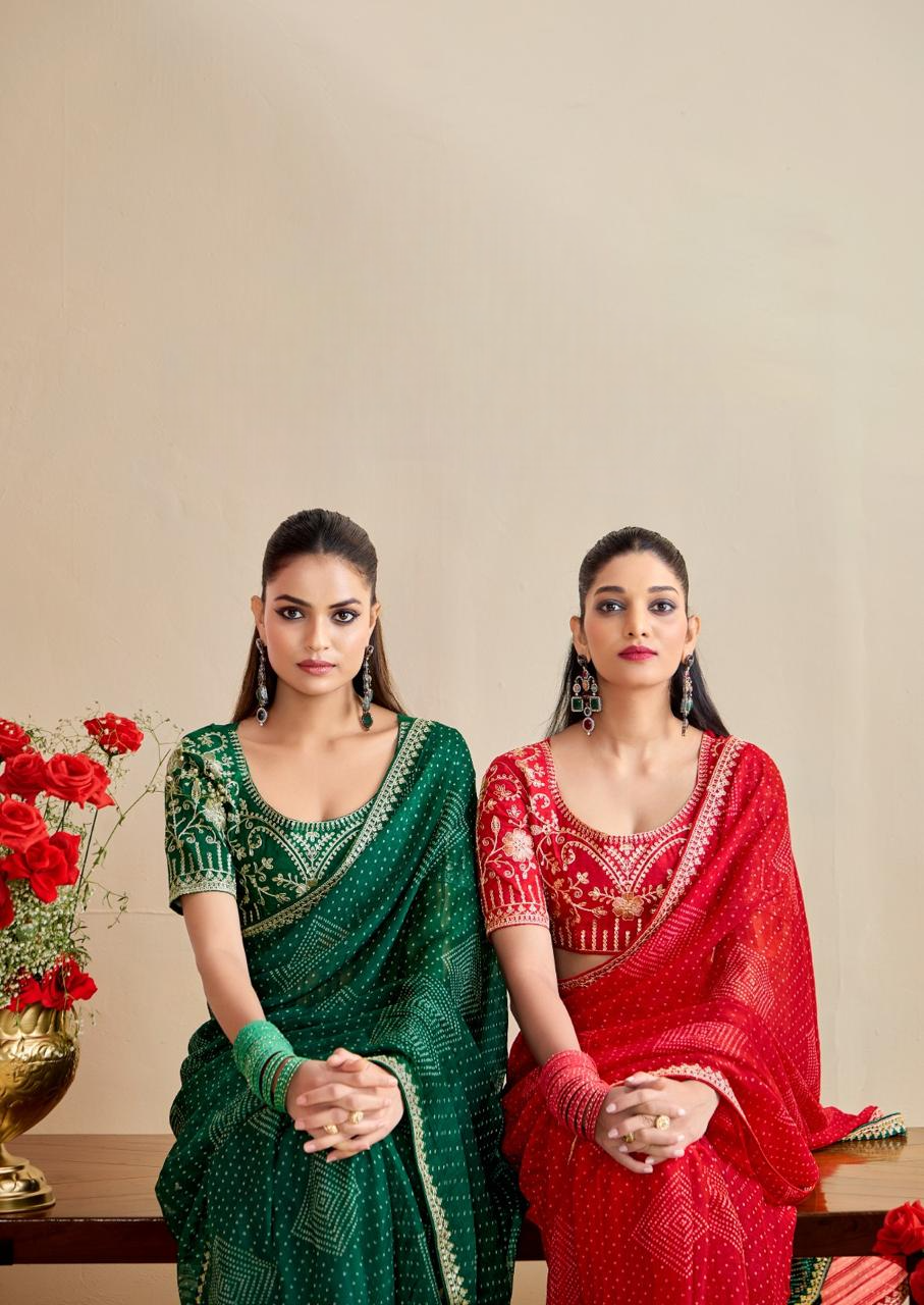 Celebrate the spirit of Shravan month with the Bandhniya Catalog by Stavan. Crafted in soft georgette with a fancy pattern, each piece features a beautifully embroidered border and matching blouse. Perfect for festive occasions, this collection blends tradition with elegance, making it a must-have for your wardrobe. Available in a complete set of 10 or as single pieces. Book yours now!